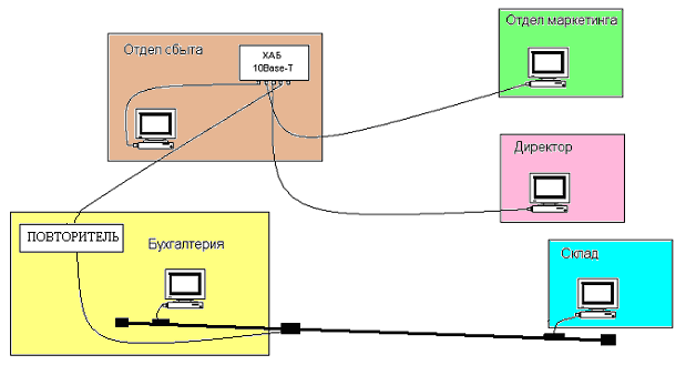 Рисунок 1. Локальная сеть организации, спроектированная по технологии 10Base-T + 10Base-5.