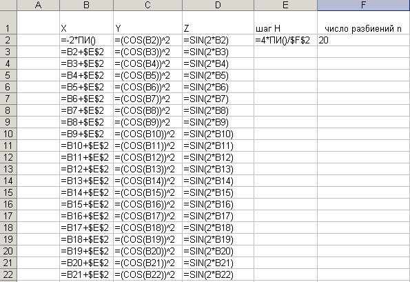 Формулы для вычисления начальных значений функций Y и Z определяются по формулам: C2=(cos(B2))^2; D2=sin(2*B2).