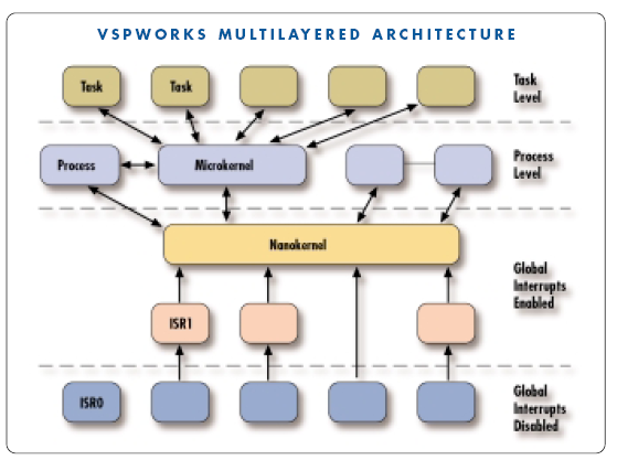 ОСРВ VSPWorks має багатошарової структурою, що служить хорошою основою для абстрагування та переносимості. Центром системи служить сильно оптимізоване наноядро (nanokernel), яке здатне керувати сукупністю процесів. Нижче наноядра знаходяться програми, які обслуговують переривання, вище наноядра розташовується Мікроядро, яке управляє багатозадачному режимі з пріоритетами C / C + + завдань.