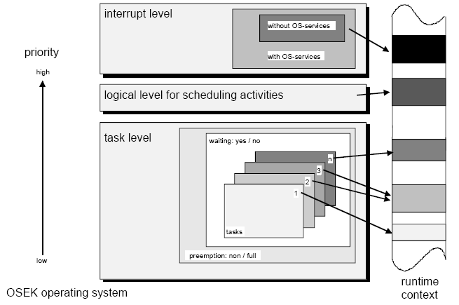 ОС OSEK забезпечує певний набір інтерфейсів для користувача. Інтерфейси використовуються сутностями, що конкурують за центральний процесор. ОС OSEK оперує двома типами таких сутностей - завдання і переривання - і визначає три рівні обробки - рівень переривань, логічний рівень планувальника і рівень завдань. Завдання вибираються на виконання відповідно до присвоєними їм пріоритетами.