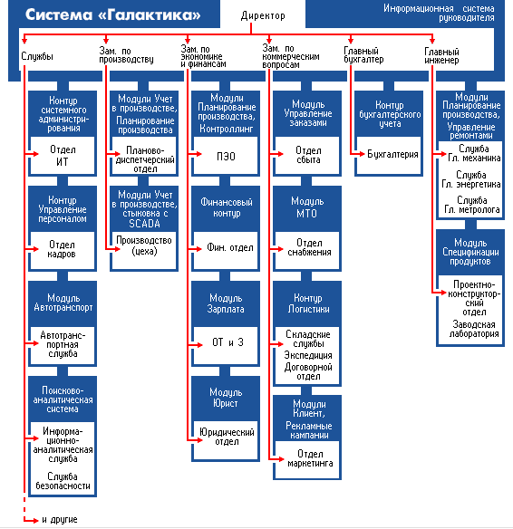 В цілому КІС „Галактика” включає п’ять контурів управління: фінансовий контур, контур бухгалтерського обліку, контур логістики, контур управління персоналом и контур системного адміністрування; чотирнадцяти модулів і пошуково аналітичної системи.