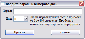 Если есть уже созданный ранее диск, то после его выбора будет отображено диалоговое окно «Ввода пароля и выбора диска»: