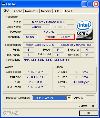 В отличие от всех 90- и 65-нм процессоров Pentium 4 и Pentium D, модели Core 2 Duo потребляют ощутимо меньше энергии. Все процессоры Core 2 Duo имеют максимальное тепловыделение 65 Вт, в то время как у линейки Pentium D оно меняется от 95 до 130 Вт. Это максимально возможное тепловыделение, но, как показывают наши тесты, среднее энергопотребление Core 2 Duo уменьшилось в два раза, а минимальное энергопотребление при низкой нагрузке и с включёнными механизмами управления энергопотреблением стало выглядеть куда лучше (таблица 1).