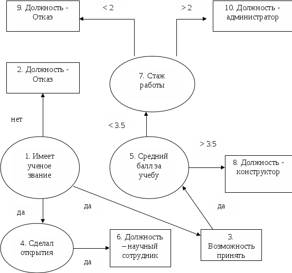 Для представления таких задач принято использовать дерево решений - специальную диаграмму для представления возможных решений. Дерево решений состоит из вершин двух типов. Вершины решений, содержащие вопросы, обозначаются окружностями. Цели или логические выводы обозначаются прямоугольниками. Вершины нумеруются. Каждая вершина может иметь не более одного входа. Рассмотрим простейший пример с приемом на работу, часто используемый в литературе [1].