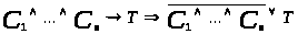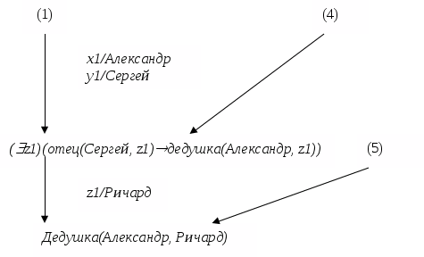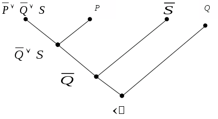 т.е. литералы правого родительского предложения добавляются к литералам левого, при этом литералы резолюции, естественно, опускаются, а в случае повторения литералов сохраняются те, что расположены слева. Резолюция допускается только с самым правым литералом предложения Ci.