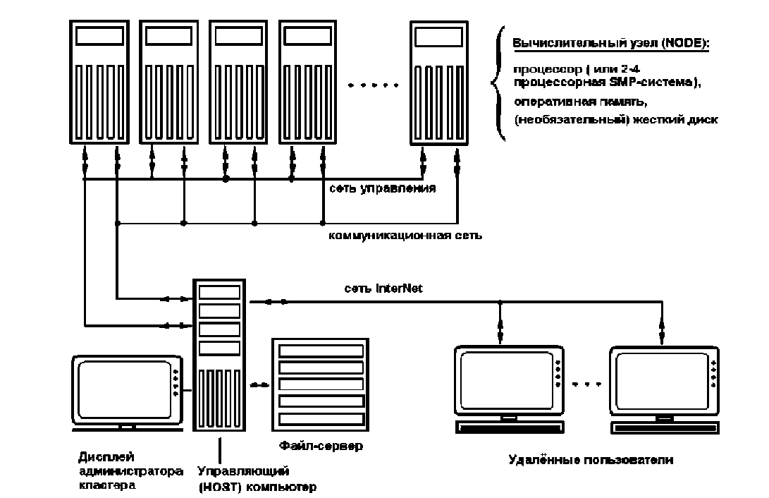 Вычислительный кластер представляет собой совокупность вычислительных узлов (от десятков до десятков тысяч), объединенных высокоскоростной сетью c целью решения единой вычислительной задачи. Каждый узел вычислительного кластера представляет собой фактически программируемых электронно-вычислительных машин (часто двух- или четырех- процессорный/ядерный SMP-сервер), работающую со своей собственной операционной системой (в подавляющем большинстве Linux(*)); объединяющую сеть выбирают исходя из требуемого класса решаемых задач и финансовых возможностей, практически всегда реализуется возможность удаленного доступа на кластер посредством InterNet.