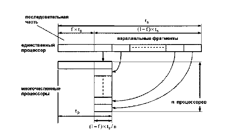 Закон Амдаля (1967) связывает потенциальное ускорение вычислений при распараллеливании с долей операций, выполняемых априори последовательно. Пусть f (0<f<1) – часть операций алгоритма, которую распараллелить не представляется возможным; тогда распараллеливаемая часть равна (1-f); при этом затраты времени на передачу сообщений не учитываются, ts – время выполнения алгоритма на одном процессоре (последовательный вариант), n – число процессоров параллельной машины.