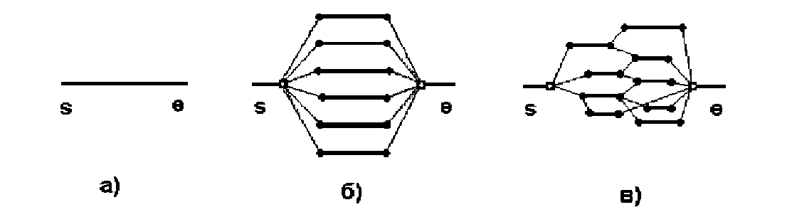 Простейшая линейная топология (рисунок 9a) удовлетворительно соответствует многим алгоритмам, для которых характерна связь лишь соседних процессов между собой (одномерные задачи математической физики и многомерные, сводимые к одномерным); недостаток – невозможность передачи сообщений при разрыве в любом месте. Уменьшение вдвое средней длины пути и повышение надежности связи (при нарушении связи сообщения могут быть переданы в противоположном направлении, хотя и с меньшей скоростью) достигается соединение первого узла с последним – получается топология "кольцо" (рисунок 9б). Топология "звезда" (рисунок 9в) максимально отвечает распределению нагрузки между процессами, характерной для систем "клиент/сервер" (главный узел "раздает" задания и "собирает" результаты расчетов, при этом подчиненные узлы друг с другом взаимодействуют минимально).
