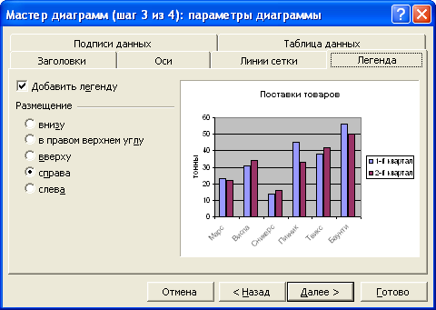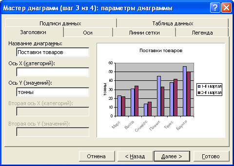 По окончании установки основных параметров диаграммы в диалоговом окне Мастер диаграмм (шаг 3 из 4): параметры диаграммы следует нажать кнопку Далее.