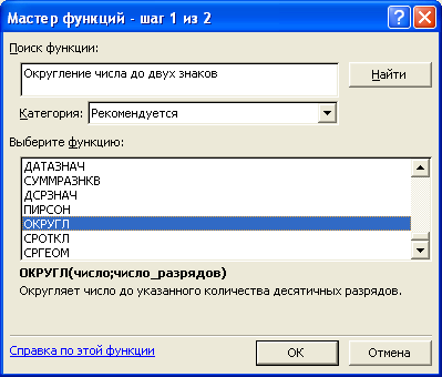 В диалоговом окне Мастер функций: шаг 1 из 2 (см. рис. 1) в раскрывающемся списке Категория необходимо выбрать категорию функции, затем в списке Выберите функцию следует выбрать функцию и нажать кнопку ОК или дважды щелкнуть левой кнопкой мыши по названию выбранной функции.