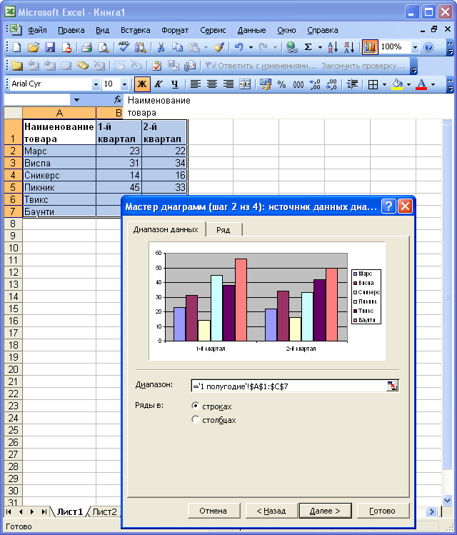Выбор источника данных. В диалоговом окне Мастер диаграмм (шаг 2 из 4): источник данных диаграммы можно уточнить или заново выбрать источник данных для диаграммы. Диалоговое окно имеет две вкладки: Диапазон данных и Ряд.