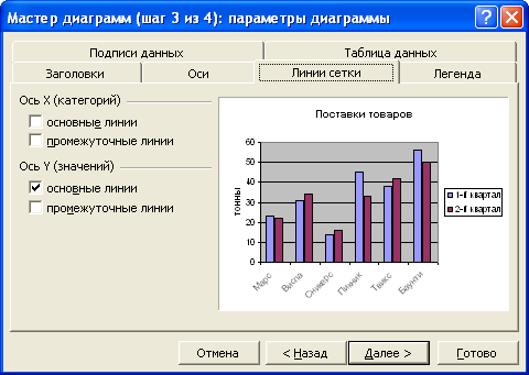 Во вкладке Линии сетки (рис. 12) можно установить отображение линий сетки. Шаг линий сетки определяется ценой деления, установленной для соответствующей оси. Линии сетки облегчают восприятие величины данных на диаграмме. С другой стороны, установка всех линий сетки по всем осям затрудняет просмотр диаграммы. Для гистограмм обычно достаточно основных линий сетки по оси значений. Для графиков и точечных диаграмм полезно отобразить основные линии сетки и по оси категорий. Вкладка Линии сетки отсутствует при создании круговых и кольцевых диаграмм.