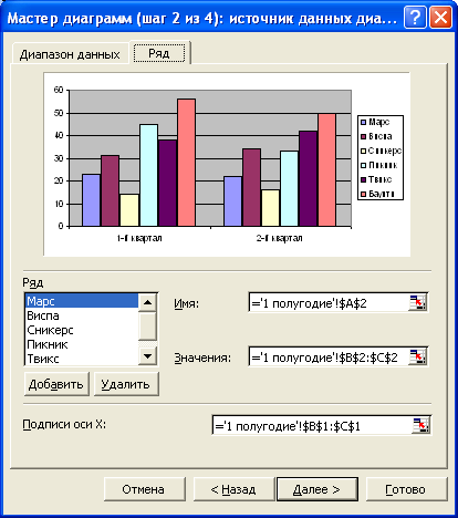 По окончании работы с источниками данных диаграммы в диалоговом окне Мастер диаграмм (шаг 2 из 4): источник данных диаграммы следует нажать кнопку Далее.