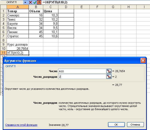 Например, в таблице на рис. 3 округляемое значение находится в ячейке А10, следовательно, в поле Число диалогового окна Аргументы функции указана ссылка на эту ячейку. А в поле Число разрядов аргумент 2 введен с клавиатуры.