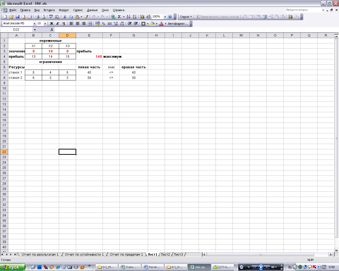 Дополнительное время использования 1 станка (опять же исходя из отчёта по устойчивости решения), не меняющее допустимость решения= +16 часов (общее время=40 часов), что позволит произвести + 4 дополнительных изделия и получить прибыль в размере 140 ед. (прирост = 16*3,5=56 ед.), при полном расходовании ресурсов обоих станков.