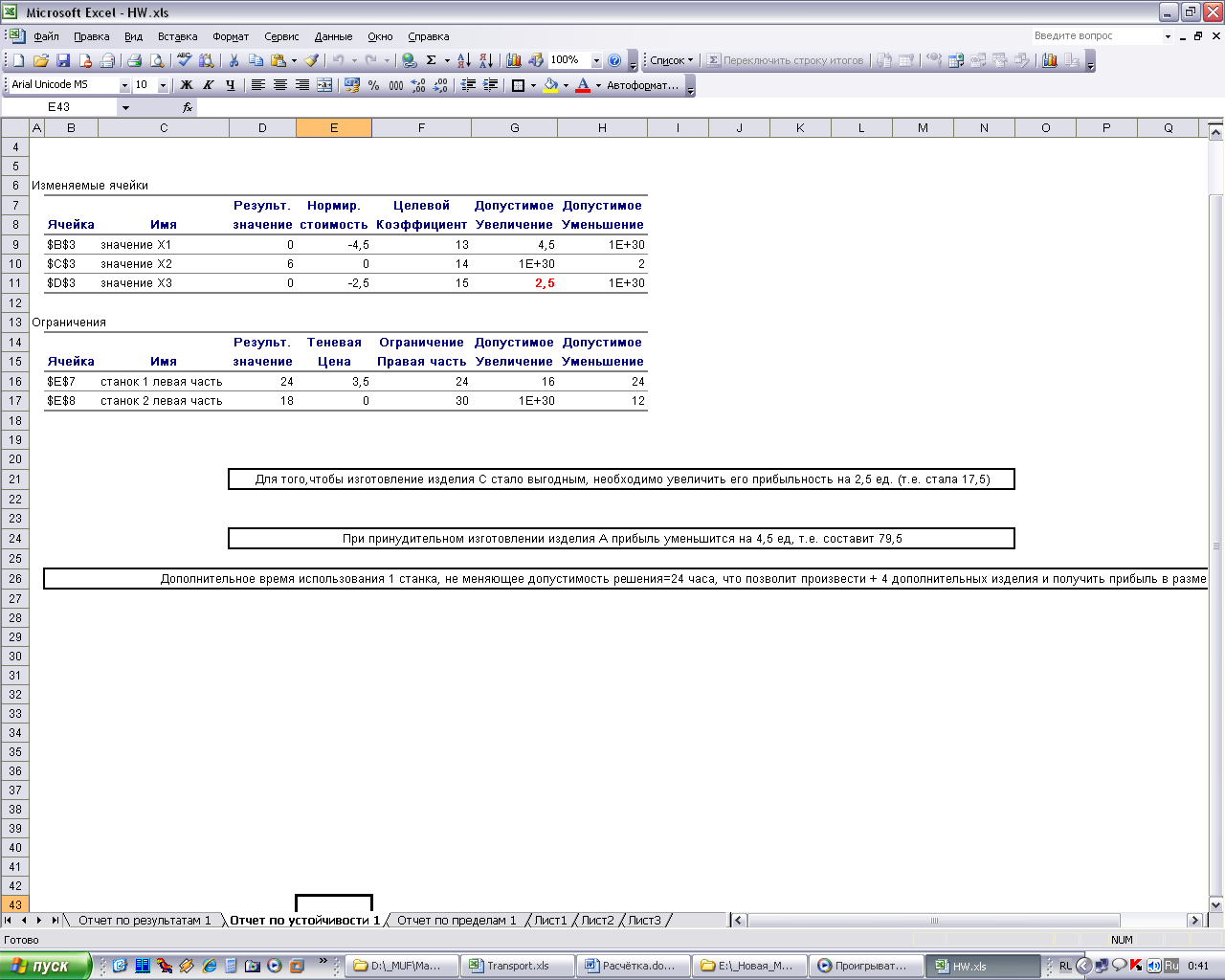 Исходя из отчёта по устойчивости решения, можно установить, что изготовление изделия С станет выгодным лишь в том случае, если увеличится его прибыльность на 2,5 единицы, т.е. составит 17,5 ед.