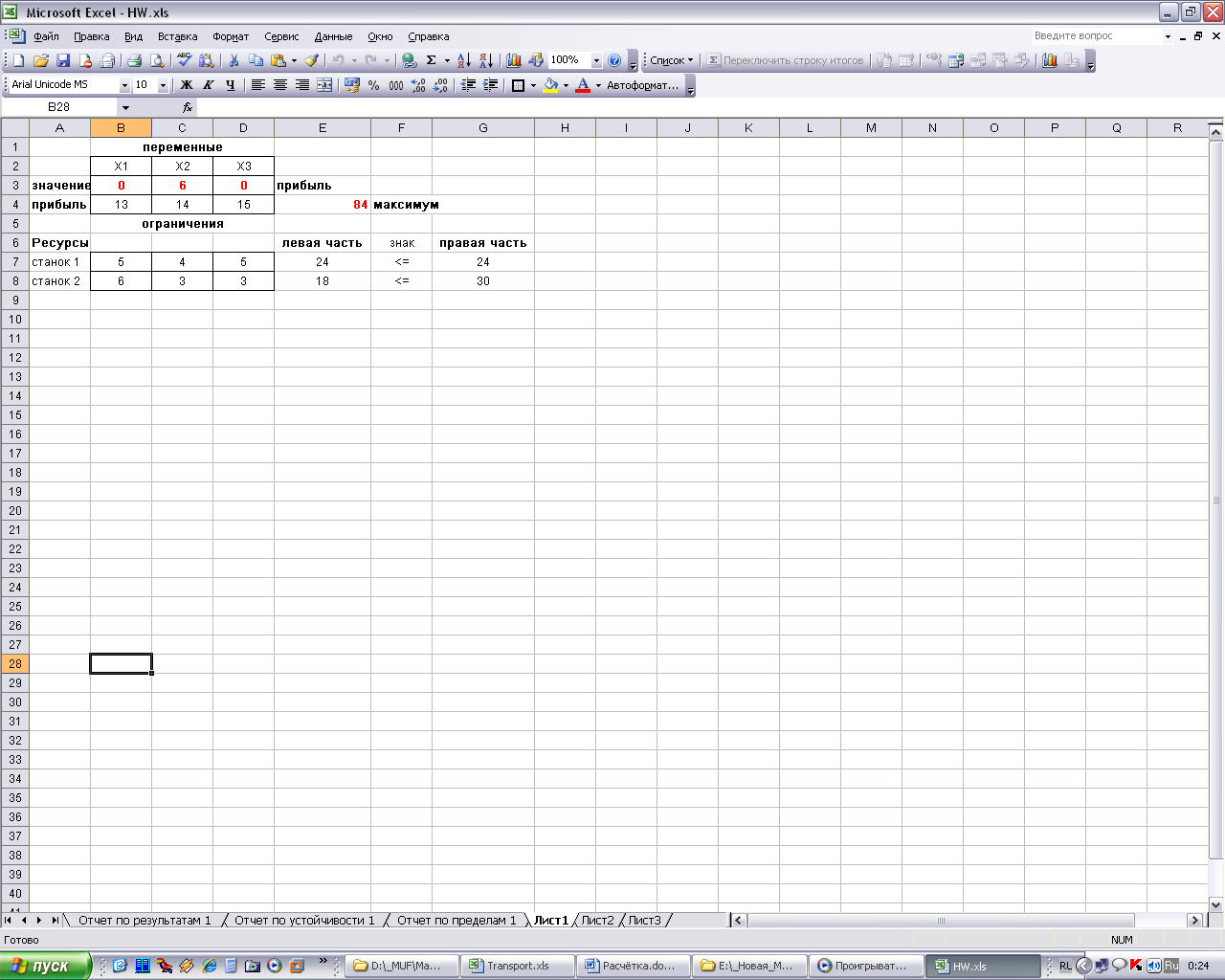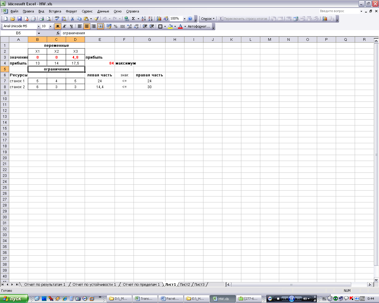 Исходя из решения оптимальный план выпуска – это выпуск изделия В в количестве 6 единиц. Этот план обусловит получение максимума прибыли в размере 84 единицы. При этом ресурс 1-го станка исчерпывается полностью, что говорит о дефицитности этого ресурса. Получить больше прибыли возможно только при увеличении этого ограничительного параметра. Второй же станок, при данном плане, будет простаивать 12 часов.