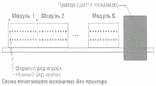 Line-принтер или принтеры параллельной печати состоит из четырех основных узлов: блока печатающих модулей, привода печатающих модулей (шаттл-механизма), вентиляторов для удаления бумажной пыли и управляющей электроники.