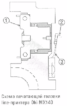 По-разному выполнены и печатающие головки line-принтеров Genicom, Oki и Tally. Genicom предлагает иголку - сердечник мощного соленоида. Tally - по-немецки отработанную конструкцию микромолоточков, Oki - трехмерный hammerbank (банк молоточков) пятого поколения. (рис. Схема печатающей головки line-принтера Oki MX140) Импульс тока, проходящий через катушку (1) электромагнита, заставляет молоточек (2) ударять по красящей ленте, а пружина (3) возвращает его на место).