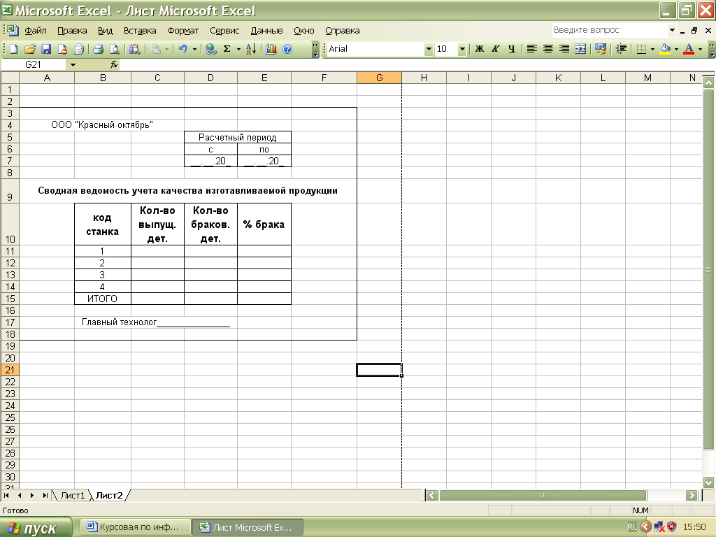 На Листе 2 формируем и заполним форму ведомости по учету некачественной продукции, для этого укажем расчетный период с 01.01. 2006г. по 31.03. 2006г., затем заполним ячейки таблицы уже известным способом