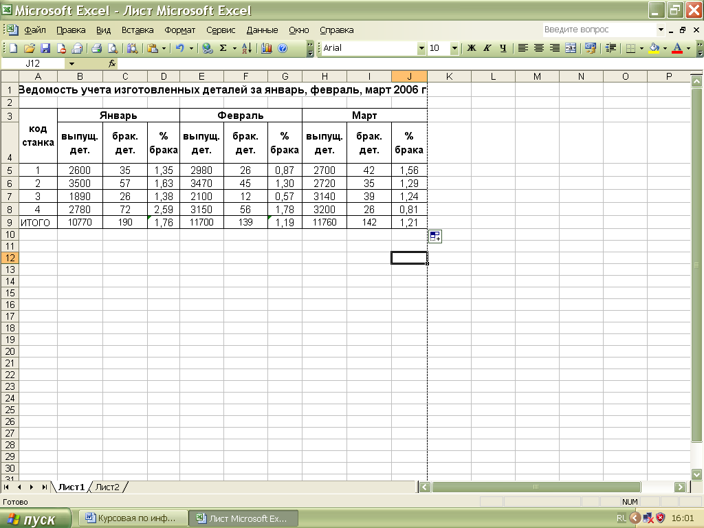 Выполняем расчет процентного отношения бракованных изделий к общему количеству выпущенных изделий, подводим итоги за месяц. Для этого на Листе 1, в таблице "Ведомость учета изготовленных деталей за январь, февраль, март 2006г. " Для этого используем формулы: D5=(С5*100) /В5, аналогично D6, D7, D8, D9. В9=В5+В6+В7+В8, аналогично и С9. Таким же образом заполняются и другие ячейки, Е9, F9, G9, H9, I9, J9.