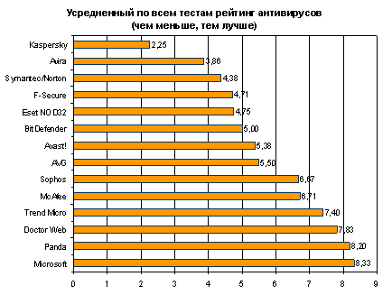 Отдельно хотелось бы поговорить по поводу тестов авторитетного специализированного журнала VirusBulletin, предчувствуя возможный вопрос — а где же информация про тесты VirusBulletin и награду «VB100%», которая в них присуждается? Увы, и эти тесты далеки от совершенства. Стандарт тестирования VirusBulletin был разработан где-то в середине 90-х годов прошлого века и с тех пор практически не изменялся. Антивирусные продукты тестируются на неком наборе зараженных файлов (так называемый ITW-набор, ITW = «In The Wild», т.е. вирусы, обнаруженные в «дикой природе»), по результатам прогонов затем делается вывод: заслуживает продукт 100% сертификата безопасности или нет. Количество файлов же в этом ITW-наборе мизерное — около двух или трех тысяч, т.е. меньше, чем появляется новых ITW-вирусов и троянцев всего за один месяц! Таким образом, увы, результат VB100% никак не говорит о том, что данный продукт действительно защищает от вирусных угроз. Данная награда свидетельствует только о том, что данный продукт прекрасно справляется с ITW-коллекцией VirusBulletin — и ничего более. Усредненный по всем тестам рейтинг антивирусов придставлен на рис.1. (см. Приложения рис.1.).
