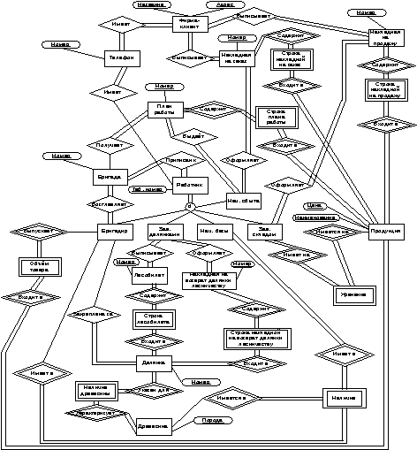 На территории предприятия находится несколько цехов по переработке древесины, за каждым цехом закреплена сушильная камера; также имеется склад готовой продукции. Цеха пронумерованы. В каждом цехе работает бригада, (в цехе их может быть несколько), которая осуществляет распиловку древесины и её сдачу на склад продукции. Бригадир получает лес от начальника базы. Приём готовой продукции ведёт кладовщик.