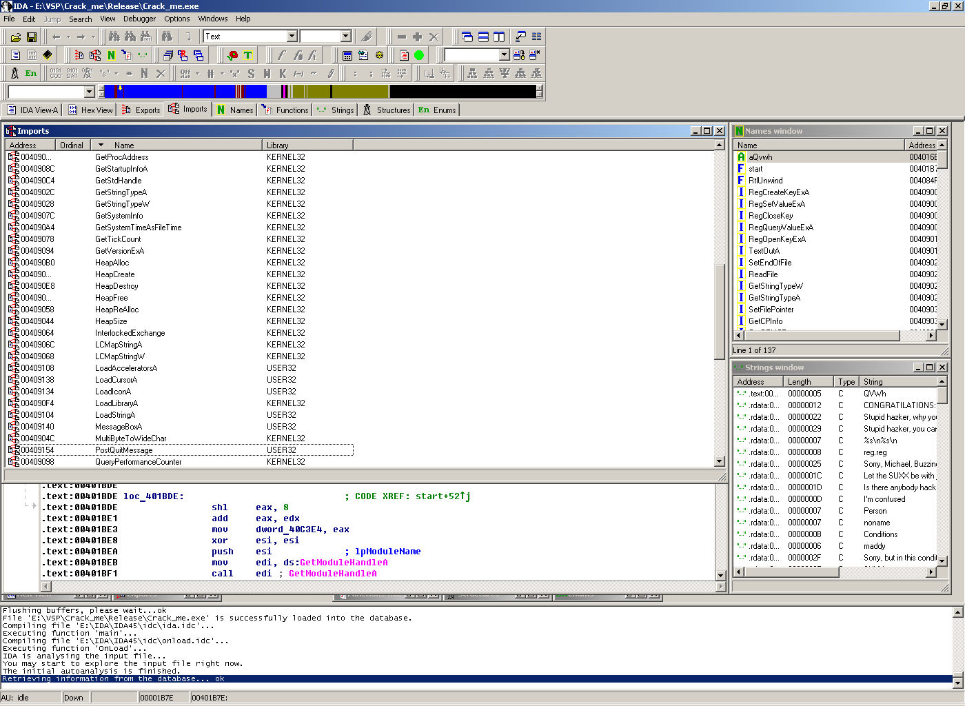 Для выполнения данной лабораторной работы нам понадобится возможность IDA показывать нам таблицу экспорта и импорта функций программы. Собственно, любая программа под Windows не является вещью в себе, а хоть как-то должна взаимодействовать с окружающей средой, в нашем случае – операционной системой. Поэтому как минимум одну функцию любая программа должна экспортировать: точку входа. Можно сказать, что в нашем случае она может послужить отправной точкой в исследовании программы. Кроме этого, большинство программ импортируют функции WinAPI, и их имена представлены в таблице импорта. В нашем случае нам понадобятся функции, ответственные за вывод информации на экран и взятие информации из элементов окна. Дабы облегчить поиск студента, ниже приводятся функции, задействованные в данной лабораторной работе: