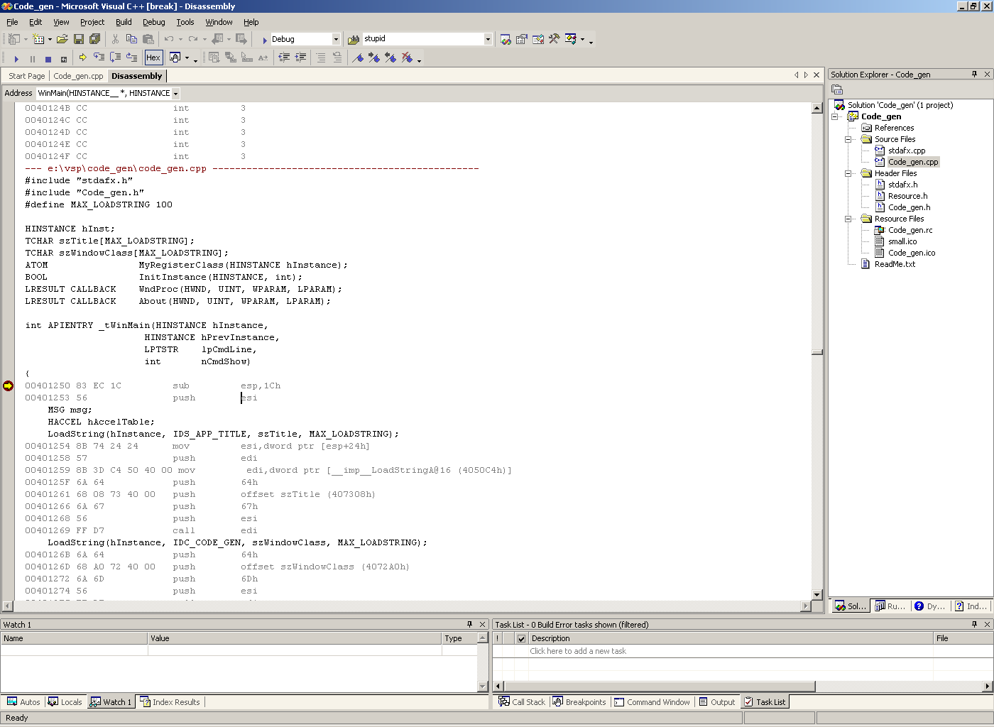 Цель: Научиться использовать средства статического и динамического анализа программ. Разобраться в основных принципах работы компилятора при генерации кода на примере MS Visual Studio 2003 (C++).