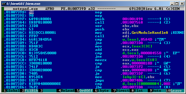 В окне с ассемблерным листингом указано смещение, hex-код, непосредственно ассемблерная команда, ему соответствующая, и расширенный комментарий. В качестве комментария часто выводится такая полезная информация, как например, имя вызываемой API-функции.