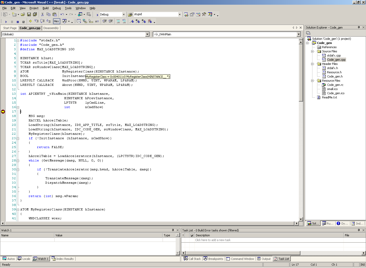 Для начала посмотрим, во что превращается обычный вызов точки входа программы. Для этого поставим точку останова на функцию _tWinMain (нажмем F9) в строке с названием функции.