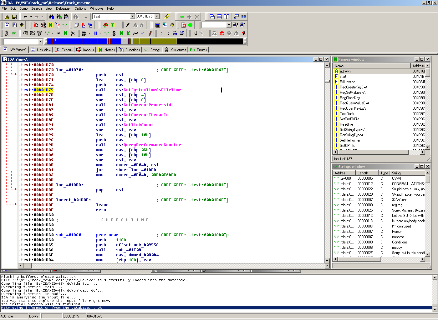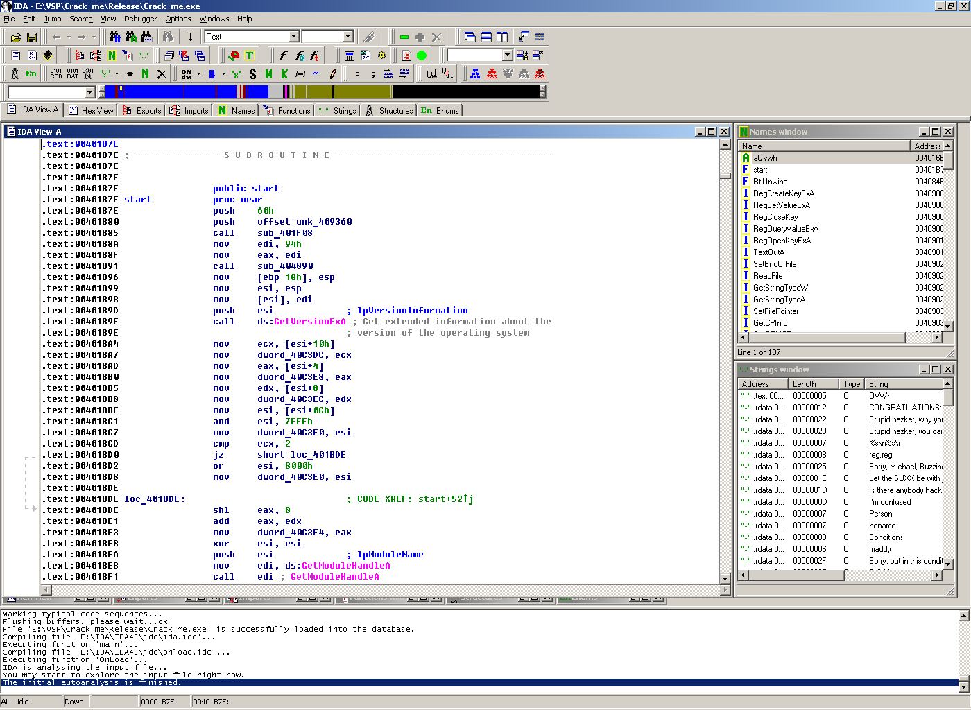 При запуске IDA можно наблюдать окошко, представленное на рис. 8. Дабы почувствовать, как работает система, выберем нашу программу для анализа, и получим результат, изображенный на рис. 9.