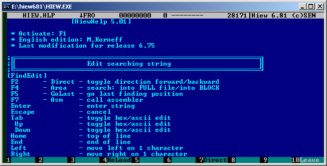 Для поиска в редакторе нужной строки достаточно нажать клавишу F7 и ввести то, что вам нужно найти либо в ASCII, либо в шестнадцатеричных кодах. Если вхождений нужной строки более чем одно, то для поиска оставшихся вхождений необходимо использовать комбинацию клавиш CTRL+F7.