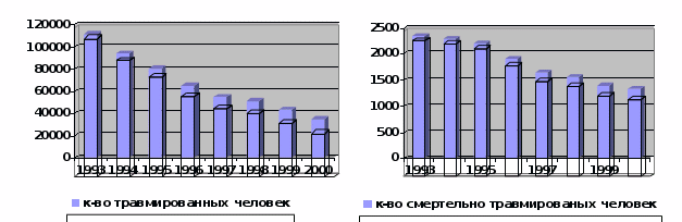 Из динамики производственного травматизма (рис.1.1.1) видно, что в последние годы наметилась положительная тенденция снижения общего и смертельного травматизма, однако уровень его остался значительно выше, чем в развитых странах Европы (таблица 1.1.1.).