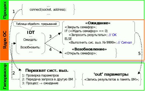 При перехопленні запиту процесу на виконання системного виклику гіпервізор копіює всі вхідні параметри виклику у власну область пам'яті і передає запит на обслуговування виклику в сервісну ВМ. Системний виклик може бути блокуючим (наприклад, read), і час його виконання в загальному випадку не обмежена. Для уникнення блокування всієї обчислювальної ВМ на час обслуговування виклику процес, який ініціював системний виклик, переводиться в стан очікування, дозволяючи іншим процесам продовжити своє виконання. При надходженні з сервісної ВМ результатів обслуговування виклику гіпервізор перериває виконання обчислювальної ВМ, виводить процес зі стану очікування і копіює результати в його адресний простір. Перебування процесу в стані очікування реалізується штатними засобами ОС в ВМ без вмешівательства в роботу механізму управління процесами в операційній системі.