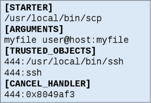 Монітор визначає, для яких процесів слід запитувати довірений режим виконання, ґрунтуючись на спеціальному файлі конфігурації – паспорті завдання (рис. 2). Паспорт містить ім'я спочатку завантажується програми (не обов'язково довіреної) і список переданих їй параметрів командного рядка. Основна частина паспорта складається з набору шаблонів для ідентифікації нових процесів, для яких слід запитувати включення довіреної режиму. Для кожного шаблона вказується унікальний ідентифікатор довіреної програми, зареєстрованої в гіпервізора. У гіпервізора для кожної зареєстрованої програми перерахований набір хеш-кодів, що дозволяють перевірити, що запускається програма дійсно є однією з довірених [1].
