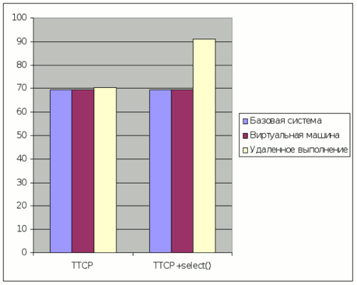 На малюнку 6 наведено результати тестування системи на утиліті TTCP, що виконує в циклі передачу пакетів між двома машинами в мережі. Перша діаграма відповідає оригінальній TTCP утиліті, друга – модифікованої, в яку ми додали виконання системного виклику select перед кожною посилкою пакета. Системний виклик select в даному випадку виконується віддалено, тобто відповідає синтетичному тесту select (RemoteFD). При виконанні оригінальної утиліти накладні витрати на віддалене обслуговування системних викликів склали всього 2% від сумарного часу виконання програми. Додавання системного виклику select збільшило накладні витрати до 31%, однак навіть у цьому випадку вони значно менше витрат в синтетичному тесті select (RemoteFD), де час виконання збільшилося в 189 разів.