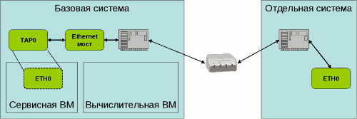 Доступ віртуальної машини до мережі здійснюється за допомогою створення в базовій ОС штатними засобами ядра ОС програмного мережевого інтерфейсу (TAP0). Цей інтерфейс є образом мережевого інтерфейсу (ETH0) віртуальної машини в базовій системі. Прив'язка інтерфейсу TAP0 до фізичної середовищі здійснюється через програмний Ethernet-міст (bridge) в ядрі базової ОС, також організовуваний штатними засобами ОС Linux. Така конфігурація (мал. 1) дозволяє відкрити ВМ для інших машин в мережі, на відміну від конфігурації QEMU за замовчуванням, що приховує ВМ від інших машин в мережі за допомогою механізму трансляції мережевих адрес (NAT) і роздільної лише вихідні з'єднання в ВМ.
