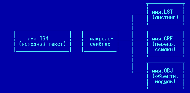Розширення імен файлів, показані на малюнку, приймаються за замовчуванням. Файл лістинга містить роздруківку вихідного тексту у відповідності зі специфікованими директивами асемблера режимами і діагностичними повідомленнями про результати синтаксичного аналізу. Ці ж повідомлення дублюються на консолі.