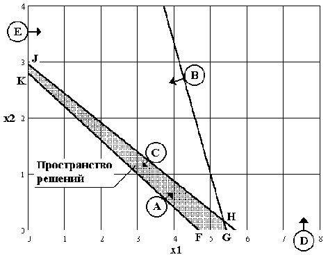 Любая точка, расположенная внутри или на границе области, ограниченной ломаной FGHJK, является допустимым решением, т.к удовлетворяет всем ограничениям.