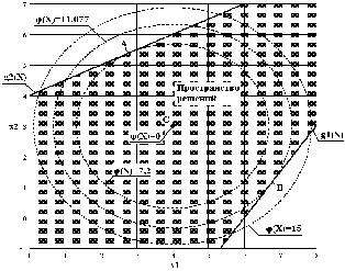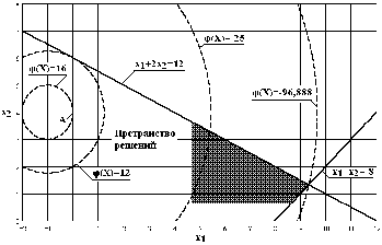 чем дальше точка от центра окружности, тем всё меньше целевая функция, максимум целевой функции будет в точке касания окружности вертикальной оси координат (точка А на рис.5), при этом: х>1> = 0; х>2> = 4