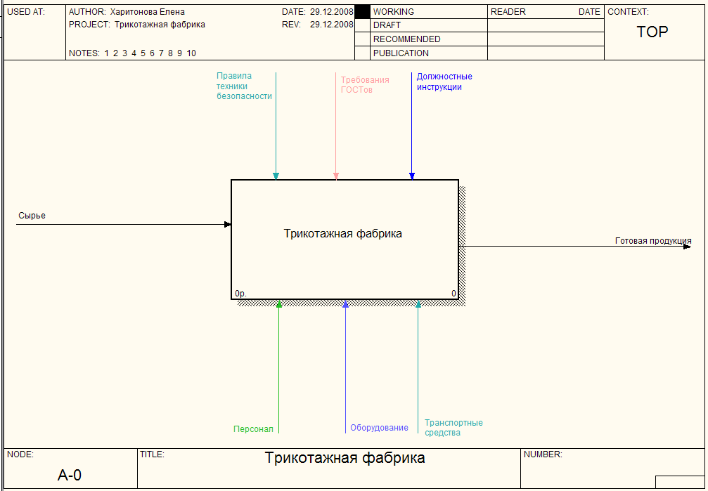 Модель IDEF0 всегда начинается с представления системы как единого целого – одного функционального блока с интерфейсными дугами, простирающимися за пределы рассматриваемой области. Такая диаграмма с одним функциональным блоком называется контекстной диаграммой, и обозначается идентификатором «А 0».