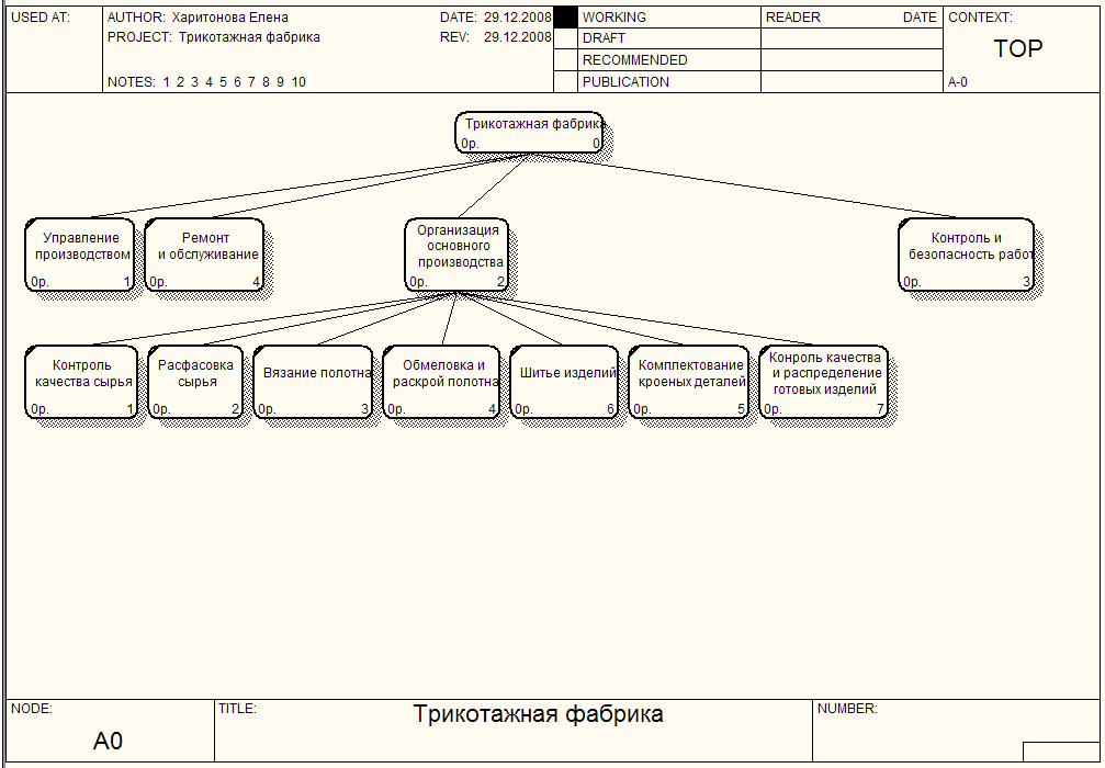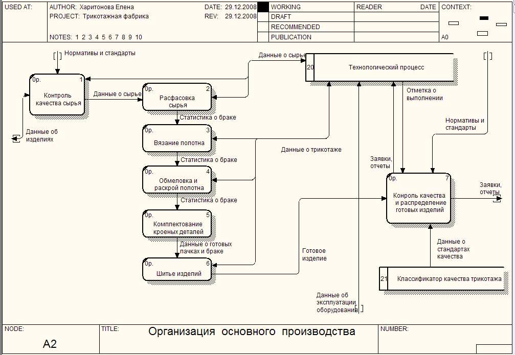 С помощью средств BPwin в данной работе удалось максимально приближенно и подробно описать работу трикотажной фабрики, начиная от поставки сырья (нитей и пряжи), его обработки, пошива изделия и до отгрузки в торговые точки и заказчикам. Результатом этой работы служит – структурированность данных, способствующая нахождению проблемных мест, и соответственно отладка процесса пошива, возможность снижения затрат, а следовательно и повышение прибыли предприятия «Трикотажная фабрика».