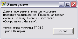 Здесь вы можете запустить или остановить процесс моделирования, выйти из программы, а также вызвать форму "О программе" (рисунок 4).