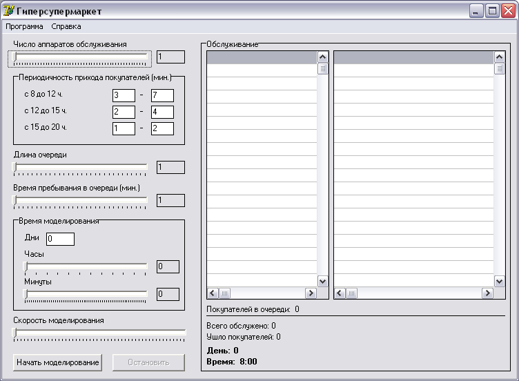 В нижней части формы расположена информация о времени моделирования. Так как магазин работает с 8.00 до 20.00, то время на часах не будет выходить за эти пределы.
