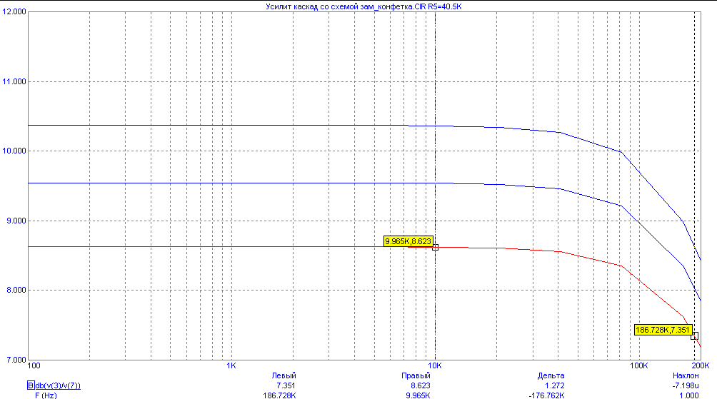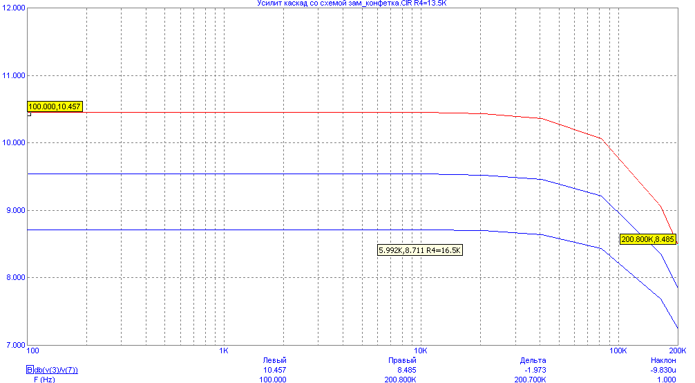 Спостерігається зниження Кп (8.62Дб) на 8.4% від запланованого, при збільшенні опору резистора R5, і збільшення Кп (10.36Дб) на 9,9% від запланованого, при збільшенні значення резистора.