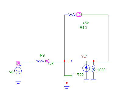 Замінимо операційні підсилювачі на залежне джерело I(U>+->), R>вх> і R>вих>. Значення вхідного опору дуже велике (109 ), тому його можна проігнорувати, тобто виключити зі схеми. Вихідний опір дорівнює значенню 1 кОм, коефіцієнт операційного підсилювача 1000, тому можемо знайти значення S. Зробимо його розрахунки: S=Kп/Rвих. За паспортними даними, Кп=50000, тому :