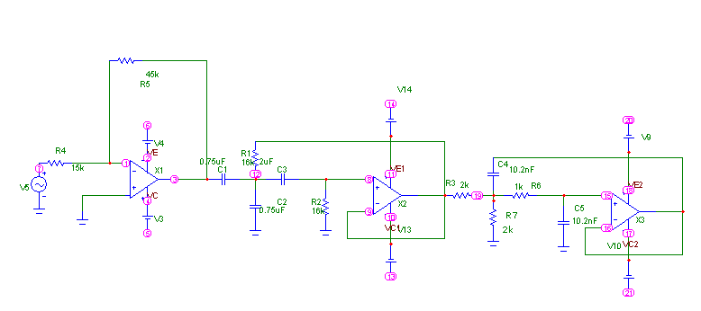 Схема призначена для посилення вхідного сигналу та його фільтрації на заданих частотах. Може бути використана для фільтрації частот звукового діапазону в звуковідтворювальної апаратури акустичних систем.