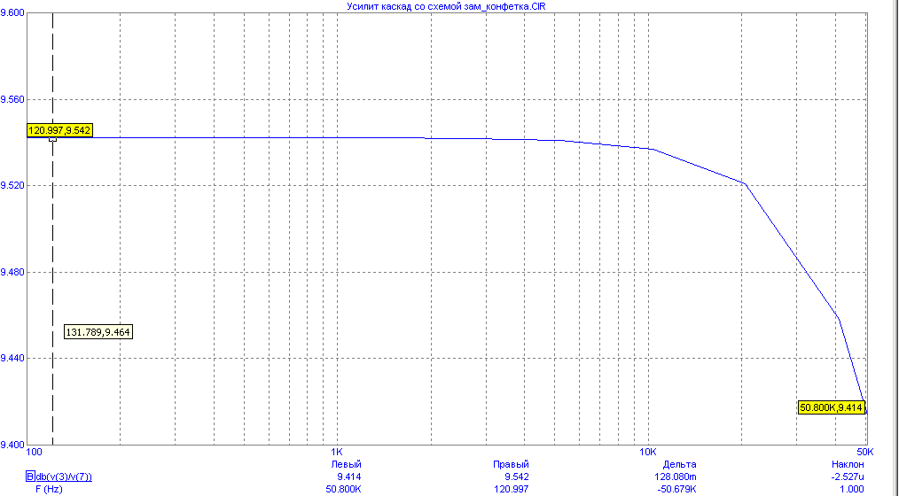 З графіку видно коефіціент підсилення дорівнює 3 або у 9.5Дб, як і було розраховано.