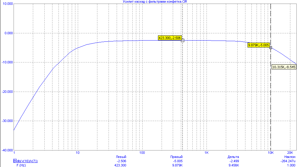 На рівні 3Дб коефіціенту підсилення приходиться частота зрізу 10 Гц, що свідчить про вірність розрахунку ФВЧ.